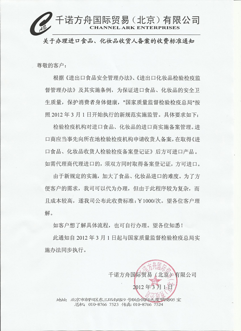 辦理進口食品、化妝品收貨人備案收費標準通知